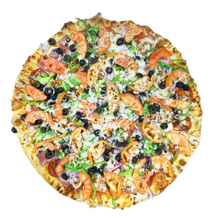 Our favorite! Smothered with assorted cheeses, pepperoni, sausage, ham, mushrooms, tomatoes, green peppers, red onions and black olives.